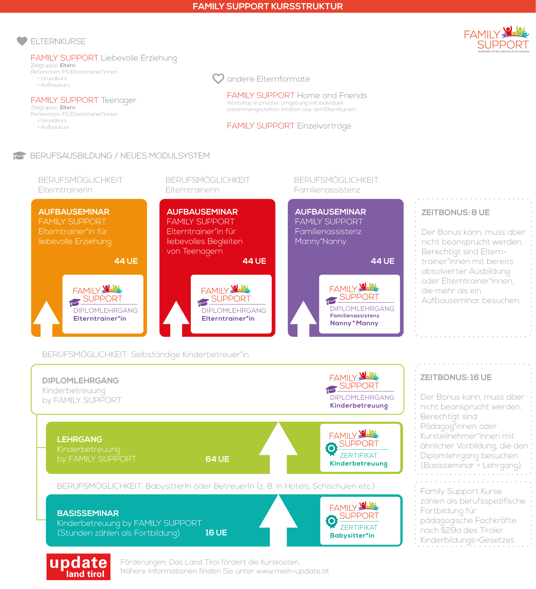 Die Aus- und Weiterbildungen von Family Support eröffnen neue Perspektiven in der Kinder- und Familienbetreuung – von der gelegentlichen Kinderbetreuung bis zur professionellen Familienbegleitung. Sie zählen auch als berufsspezifische Fortbildung für pädagogische Fachkräfte nach §29a des Tiroler Kinderbildungs-Gesetzes.
